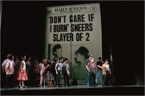 There was an Hormigueros sequence in the original Capeman, and the fact that it’s missing here seems to imply that it disrupts the flow of the new streamlined version, designed to emphasize the strength of the music. But I seem to remember that it was the difficult and complex nature of Sal’s experience that confused some people and turned off others, perhaps causing Ben Brantley, the New York Times reviewer who mysteriously finds this new version palatable, to say the original production “register[ed] as one solemn, helplessly confused drone. It’s like watching a mortally wounded animal.”