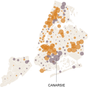 The New York Times’s willful sublimation of truth to its self-defining real estate interests is nothing new, but I guess as the “times” themselves become more transparently oppressive, the Times’s oblivious “objectivity” becomes more galling. Just published yesterday and accessible through a moderately visible link on the “New York-Region” page, the graphic above is headlined “Then As Now–New York’s Shifting Ethnic Mosaic.” According to data recently released by the American Community Survey, say the authors, in the past 10 years, “Traditional ethnic enclaves sprawled amoeba-like into adjacent communities. Once monolithic tracts of white and black and native-born residents have become bespeckled with newcomers.”