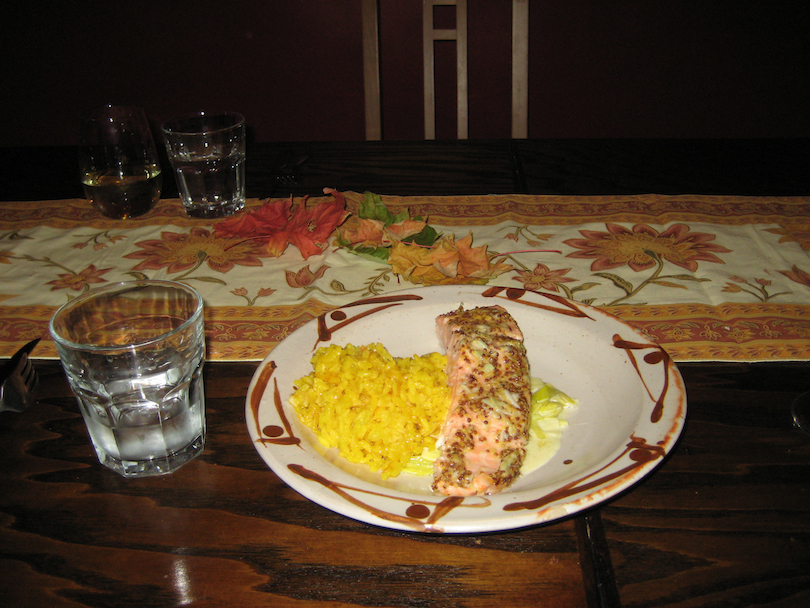 In case you’re wondering, this would be baked salmon with a mustard sauce and saffron risotto, plus leeks.