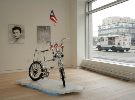El rostro de Felícita Méndez se puede ver casi sonriendo en frente de la bicicleta “Cotton Picker,” nunca imaginando que iba llegar al Barrio. Podría ser una de las caras lindas de Tite Curet Alonso, pero ella ya estaba fuera de la isla cuando el nació. Podría ser una de esas salseras de los años ’70s discutiendo si era La Lupe o Celia Cruz la reina verdadera, pero ella no fue parte de esa famosa Gran Migración. Felícita actualmente formó parte de una historia bastante desconocida de obreros puertorriqueños reclutado para trabajar sembrando algodón en Arizona. Felicíta was a precursor of what some of us call “Other Ricans,” that is Boricuas who migrated to places outside our traditional U.S. strongholds of New York, Philly, Boston, Hartford, Cleveland…Tampa. How dignified she appears next to the crude misspelling in the headline, “Further Entry of Porto Ricans Protested.” “Porto-Rican,” not far off from Piri Thomas’s “Porty-Rican,” was the sobriquet affixed to la isla in the first half of the 20th century, symbolic of the attempt to Anglicize our identity, and make it easier for enterprising imperialist minds to read the name of their new possession as it appeared on maps and public records. More than 80 yeas before Arizona’s heinous law against Latino being, there was palpable disgust directed against Puerto Rican migrant workers brought in to replace Mexican workers who had fled further north. “The fact that Arizona was the site of such immigration and labor related controversy in the 1920’s seems all the more relevant today,” comentó Luciano. “What was especially significant to me about the story is the fact that Puerto Ricans protested their mistreatment almost immediately. As much as it was a story of exploitation it was also a story of resistance among Puerto Rican laborers who refused to be taken advantage of.” El estado de Arizona se ha convertido en un símbolo de la reacción xenofóbica de las fuerzas conservadores en los Estados Unidos contra los imigrantes Latinos, y algunas veces llega a niveles absurdos, como el caso deesta maestra de escuela, que enfrenta discriminación debido a su acento cuando habla inglés. Esta farsa en Arizonza fue replicada recientemente en Alabama, el estado que pasó un proyecto legislativo que es tan oneroso que el mismo Departamento de Justicia  están tratando de bloquear algunas partes de la ley. Pero lo que pasó a Felícita después de abandonar Arizona era hasta más sorprendente. “In 1935, she married Gonzalo Méndez, a native of Mexico who had naturalized as a U.S. citizen,” writes Luciano in his artist’s statement for the show. Together they ran a small farm in Orange County on land they leased from a Japanese- American family that had been put in an internment camp during World War II. In 1946, they took their children to register in the local elementary school, but their children were denied entry based on their skin color and ethnicity. The Méndez family refused to accept this policy of discrimination and took the school district to court. In what became a landmark case, Méndez v. Westminster would reach the highest courts in California. The Méndez family paid for the lawyer themselves, with money earned from their farm. In 1947, the courts would rule in favor of the Méndezes, and California became the first state in U.S. history to desegregate public schools. It was an important precursor to Brown v. Board of Education (1954), the case that would end the segregation of schools nationwide.” Lo fascinante de esto es que Méndez vs. Westminster es mencionado mucho por Mexicanos-Americanos como un ejemplo que han tenido una historia de luchar contra el racismo en los Estados Unidos paralelo a la de los Africanos-Americanos. Pero lo que no es tan conocido es el hecho de que los hijos Méndez nacieron de una mamá puertorriqueña. Esto es una manifestación clásica del otro-rriqueño–y una prueba que es casi imposible aislar la escencia de un grupo étnico o una raza. “I myself am Other Rican,” Luciano explained, born on the island but grew up primarily between Seattle and Miami, and now based in New York. “I’m interested in questioning both the stereotypes that have been placed upon us, as well as those we place upon ourselves.” Y cuales son ellos? El acento, el baile, la comida, el machismo, la sensualidad, el coco, la felicidad? Alguien me dijo una vez que la música de los paises pobres se hace para levantar la felicidad porque la gente están sufriendo y necesitan olvidar. Pero prohibido olvidar, chacho/a. Lo que me parece que necesitamos ahora es un poco más horizontalidad. Eso es lo que pasó cuando por primera vez conocí a los líderes estudiantiles Adriana Mulero, René Reyes, y Giovanni Roberto después de una charla en Rutgers Universidad. Los yupis no permitieron business as usual–la entrevista se convirtió en una discusión en donde no había objetos ni sujetos. Era un intercambio de ideas. Y cuando esa noche llegaron al Occupy en el parque Zuccotti y hablaron a la asamblea general, en inglés, se oyó el mensaje de Puerto Rico en la era de globalización: Porto Rico? Pepper spray, just like New York! En ese momento, nos ocupamos de ocupación: todos somos otrorriqueños. Lo “otro” es lo que nos hace lo mismo. Creo que eso es lo que estaba planteando José Luis González en “La Noche que Volvimos a Ser Gente,” allí en los rufos de Martorell, que se pueden ver también en la galería del Barrio. Somos una gente que pueden aprovechar de las estrellas cuando se va la supuesta luz. “Having the bike in the window was deliberate and something I appealed for,” said Luciano. “It’s a beautiful shiny bike from the outside, and directly reflects the bike culture of El Barrio. I want it to invite the community to come inside and see more.”